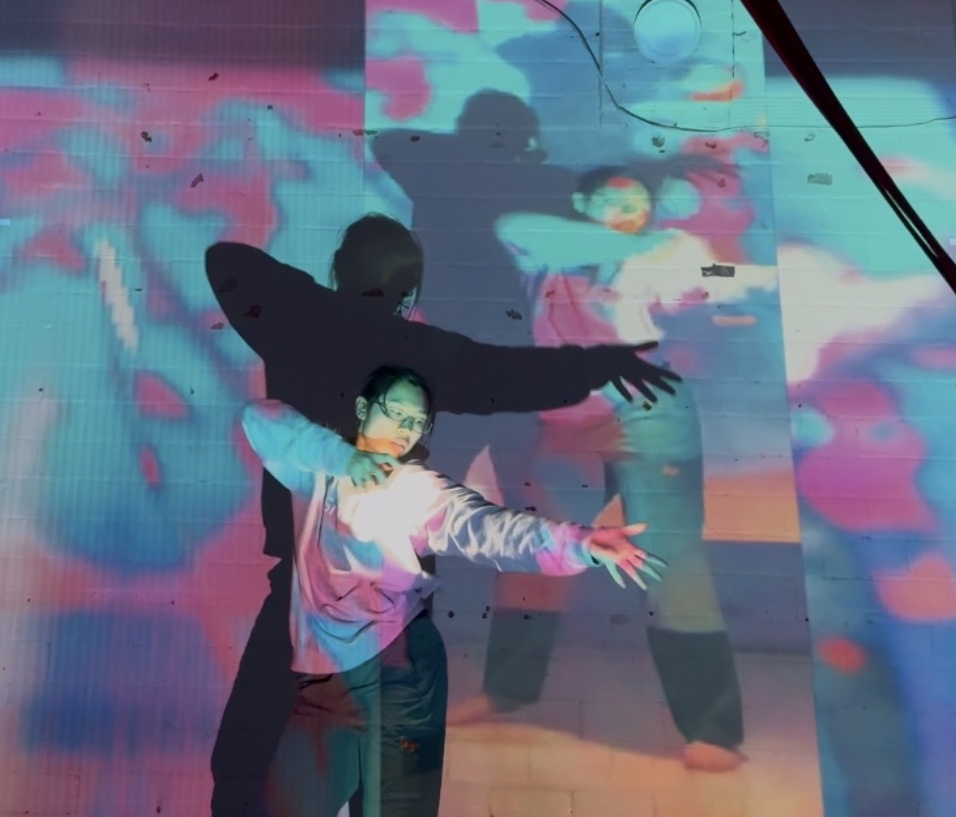 camera quality projection brightness (maybe) back-projection (maybe) backdrop quality while trying to improve the contrast of the projected image, i had m. hold an rgb light, and we found an unintended pleasing of feedback loop with the dominant color changing the background.