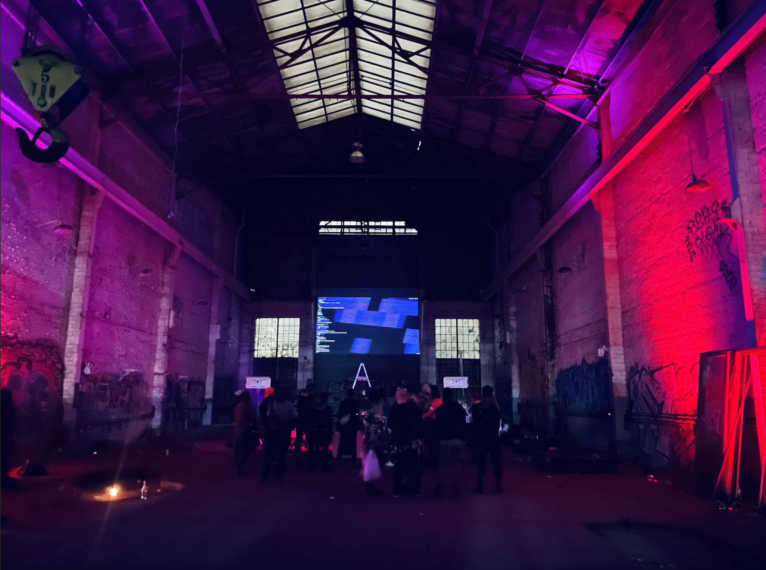 i took a simple existing function from the hydra library and added a few lines for audioreactivity (color and distortion); black background was key to keep this looking more subdued and adding some forgiveness to the projected edges.