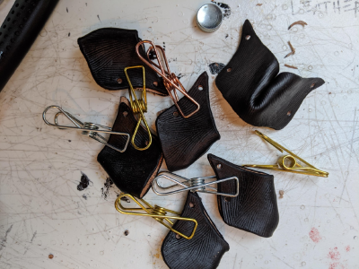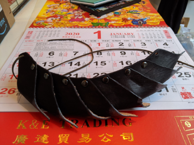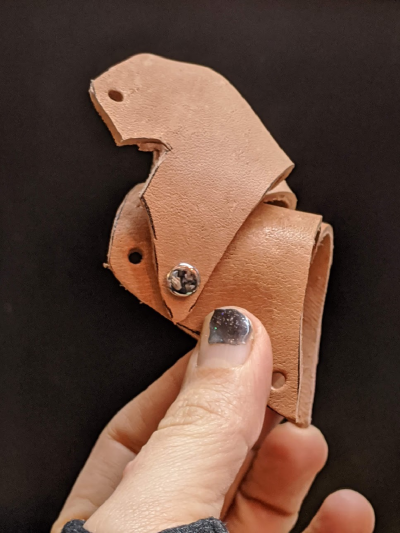 articulated leather spine: veg-tan, rivets, hand-tooled, hand-painted. molded. i made this piece in 2019 but took this photo later, modeled by faited.