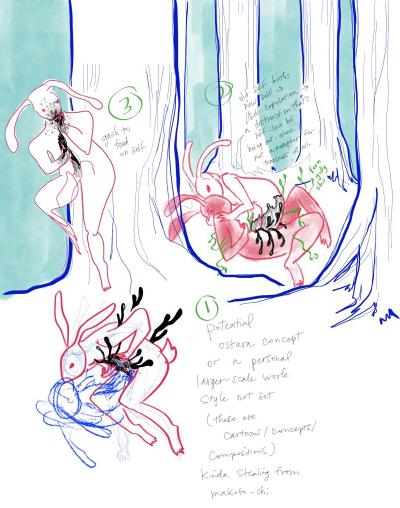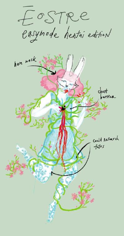 i felt that the prompt was exploring the same questions i had about my own transness at the time, so i thought about the composition of this illustration for hours a day (and previously had been thinking of doing a larger-scale painting that was less palatable (read: more abject-suffering and less sexy-bunnygirls) to unearth my feelings on that).