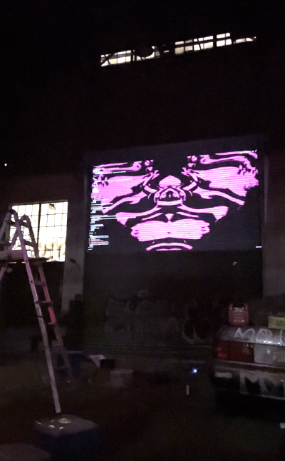 set design: there were multiple layout options and i argued for using this space, whose symmetry felt good and whose proportions felt cathedral-like, setting the stage distance so that dancers could enter and immediately see a long corridor of increasing intensity. projection on the roll-up door between the two windows attempted to integrate the visuals as harmoniously as possible into the space, though i wished we could have projected the full length of the door. lighting on the sides was not my design (designed by A.L. and W.) but added a lot imo, demonstrating to the dancer the height of the space which otherwise would have been obscured by the darkness.