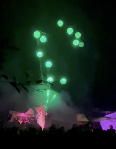 Concept: a laser projects onto objects that diffuse light down onto the dance floor. We ended up using IR LEDs inside paper lanterns as the objects, arranged in a traditional calder mobile construction to form a sculpture. On the ground we used a camera with an IR filter, MadMapper, and Resolume to provide visual output to a laser which projected onto the sculpture.