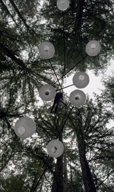 I convinced L. that paper lanterns (which we tested to be somewhat waterproof – the paper appeared to be impregnated with a plastic material) were a better aesthetic (being a more natural-looking material contrasted against the forest canopy), and not too much of a compromise on illumination. She 3D-printed a mount for the battery to go inside the lantern that would also protect it from rain.